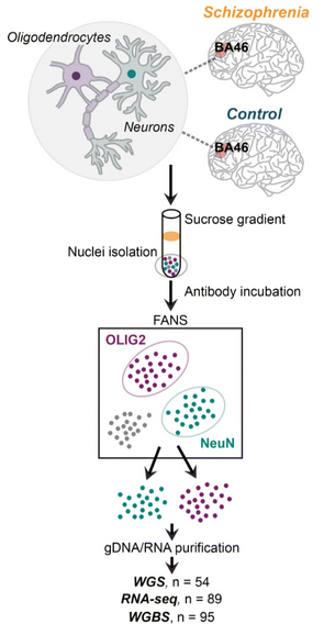 The importance of cell-type specific epigenetic variation of non-coding regions in neuropsychiatric disorders is increasingly appreciated, yet data from disease brains are conspicuously lacking. We generated cell-type specific whole-genome methylomes (N=95) and transcriptomes (N=89) from neurons and oligodendrocytes from brains of schizophrenia and matched controls. The methylomes of these two cell-types are highly distinct, with the majority of differential DNA methylation occurring in non-coding regions. DNA methylation difference between control and schizophrenia brains is subtle compared to cell-type difference, yet robust against permuted data and validated in targeted deep-sequencing analyses. Differential DNA methylation between control and schizophrenia tends to occur in cell-type differentially methylated sites, highlighting the significance of cell-type specific epigenetic dysregulation in a complex neuropsychiatric disorder. Our resource provides novel and comprehensive methylome and transcriptome data from distinct cell populations from schizophrenia brains, further revealing reduced cell-type epigenetic distinction in schizophrenia.
